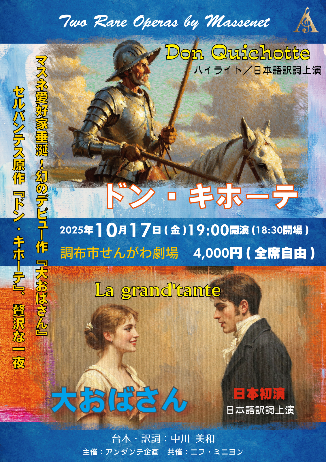 2025年10月17日(金)19:00より、マスネのオペラ「ドン・キホーテ」と「大おばさん」を調布市せんがわ劇場にて上演致します。 「ドン・キホーテ」は珍しいというわけではありませんが,上演機会はさほど多くありません。また、「大おばさん」はマスネの実質的デビューオペラで、スコアの消失などもあり、ほとんど上演されません。日本では初演だと思います。 詳細はこちらの特設ページから 共有: Facebook で共有するにはクリックしてください (新しいウィンドウで開きます) Facebook クリックして X で共有 (新しいウィンドウで開きます) X いいね:いいね 読み込み中…